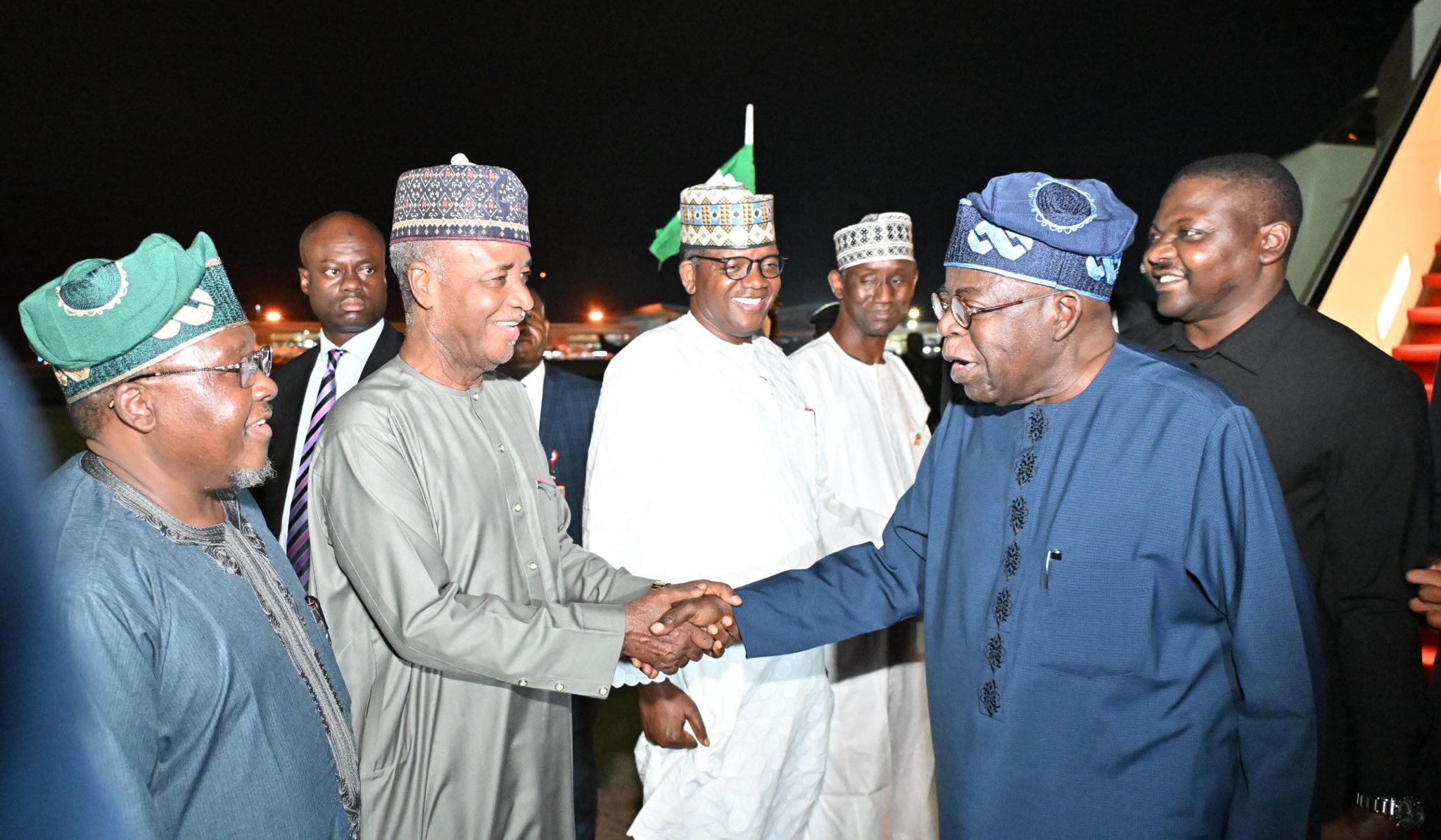He landed at the presidential wing of the Nnamdi Azikiwe International Airport in Abuja, where he was welcomed by a delegation that included the Minister of Budget and Economic Planning, Atiku Bagudu; Minister of Defence, Bello Matawalle; National Security Adviser, Nuhu Ribadu; and former Sokoto State governor, Aliyu Wamakko.